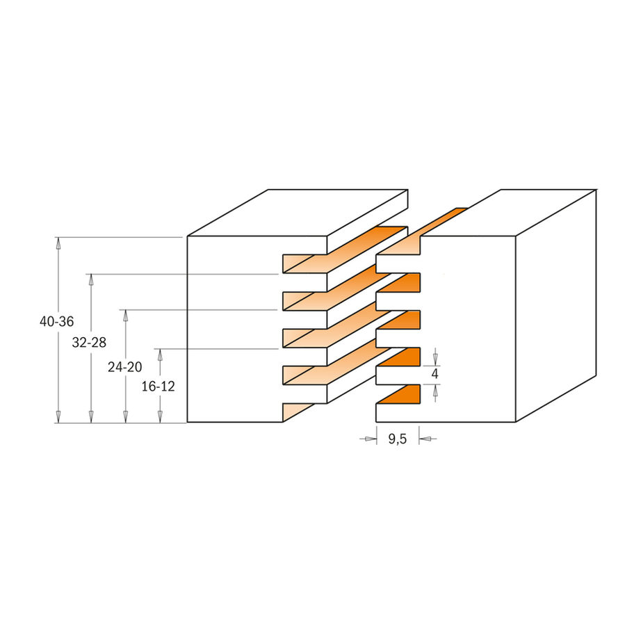 This router allows you to carry out accurate and functional finger joints with the greatest of ease. Without any adjustment you will be able to work woods with different thicknesses as indicated in the drawing. The bearing allows you to reach a 9,5mm cutting depth. For further cutting depths you need to use a fence.
